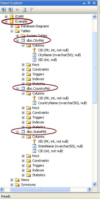 Here, below screen we can see the Database Example contains three table CountryMst, StateMst and CityMst with columns and datatype in sql server.