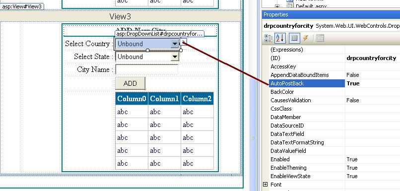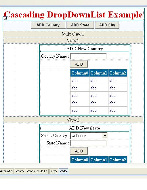 In this asp.net cascading dropdownlist example we use MultiView control for make user friendly design to easily understand. we took here three view control each for county, state and city inside the multiview control.