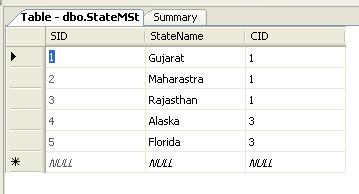 Columns : SID (primary key / AutoIncrement), StateName as Nvarchar(200), CID as intTable Name = CityMst