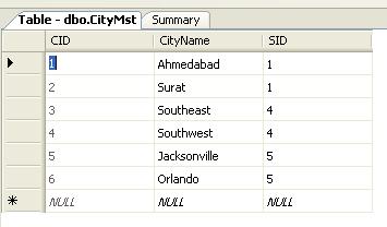 Columns : CID (primary key / AutoIncrement), CityName as Nvarchar(200), SID as int