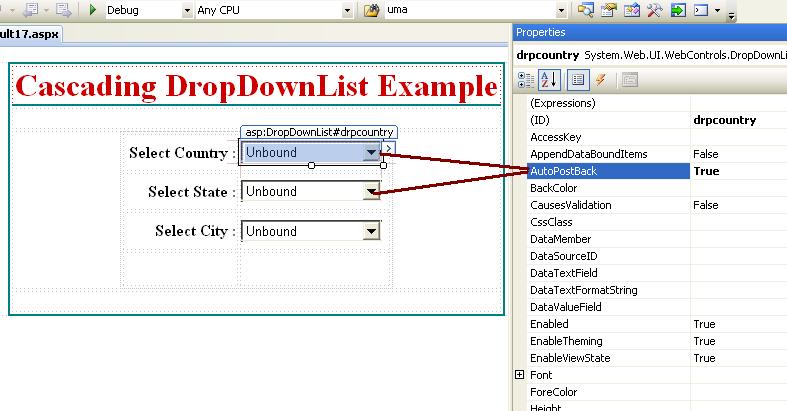 Here, when we select country from county dropdownlist then the related state will be displayed automatically in state dropdownlist control. for do this write a code behind c# code on Country Dropdownlist SelectedIndexChanged and set AutoPostBack = True