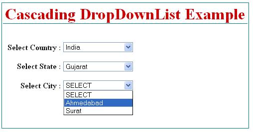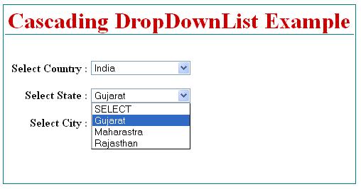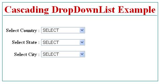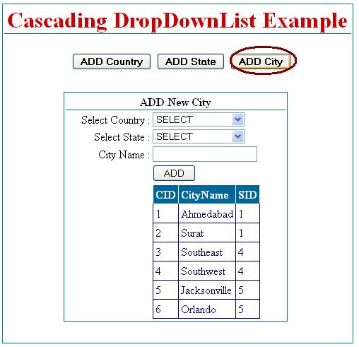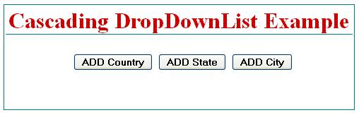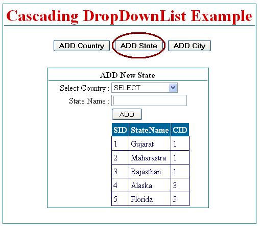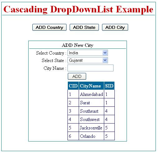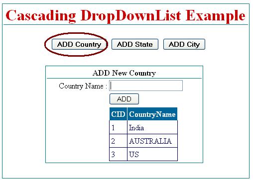 Let’s take an example to understand cascading dropdownlist from database. In above example we have insert records in to databse for country, state and city. Now desing an asp.net web page for cascading dropdownlist for country, state and city. In cascading drodownlist example we display records respectively from database, which we alreay inserted in above example.