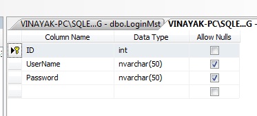 For create dynamic login form in asp.net first create database table for username and password. we have here create a table “LoginMst” with three columns the ID, Username and Password.