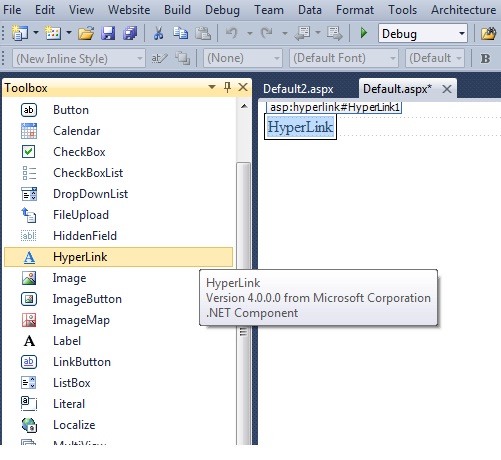 Create New web page and drag and drop HyperLink Control on web page from toolbox. below figure we can see the we have HyperLink control in asp.net web page.