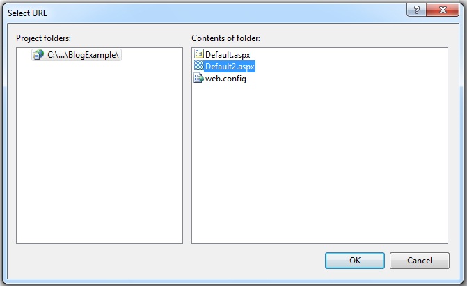 Browse and select destination page and click OK button to set NavigateUrl of HyperLink control.