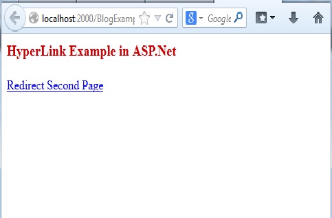 <asp:HyperLink ID=”HyperLink1″ runat=”server” NavigateUrl=”~/Default2.aspx”>Redirect Second Page</asp:HyperLink>